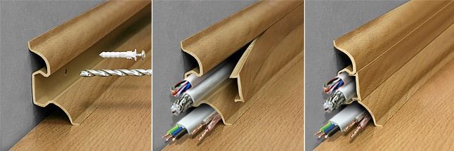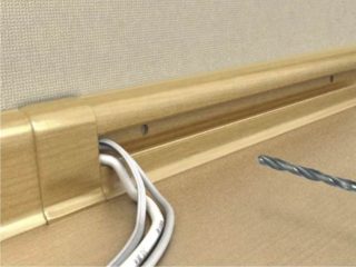 Si vous ne voulez pas poser les fils sous la bordure du mur, ou si le câblage est monté dans une maison en bois, il est préférable d'utiliser simplement un canal de câble. La boîte est fixée parallèlement à la plinthe sur les goujons. Auparavant, le capot supérieur était retiré du canal. Après avoir fixé le boîtier, le câblage y est posé et un panneau de protection est placé sur le dessus.