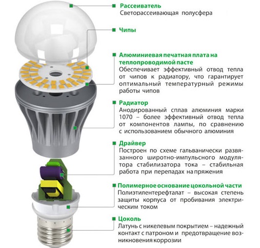 Dans les sources lumineuses classiques, la tension était appliquée directement à la spirale, qui servait de résistance active. LED contient des convertisseurs spéciaux - pilotes. Lorsque l'alimentation est appliquée, le courant traverse la base vers le convertisseur, puis vers la matrice LED elle-même. Le convertisseur modifie le courant et la tension aux valeurs optimales pour le fonctionnement.