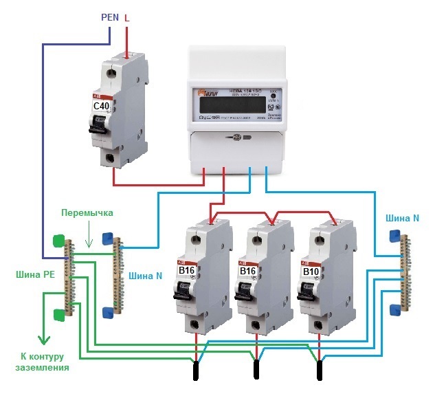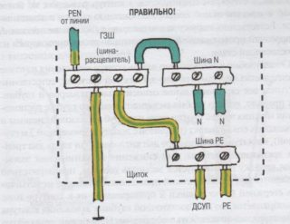 Dans les maisons privées et les appartements en ville, afin d'éviter le vol d'électricité, les représentants de l'organisation de contrôle ont le droit d'exiger que le fil PEN soit tiré jusqu'au compteur. Et ce n'est qu'après le dispositif de mesure qu'ils permettent de le diviser en un bus PE de protection et un N de travail.Une telle connexion ne contredit pas les exigences du PUE, mais la séparation effectuée avant le compteur semble beaucoup plus naturelle.