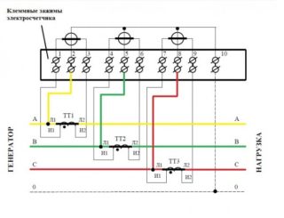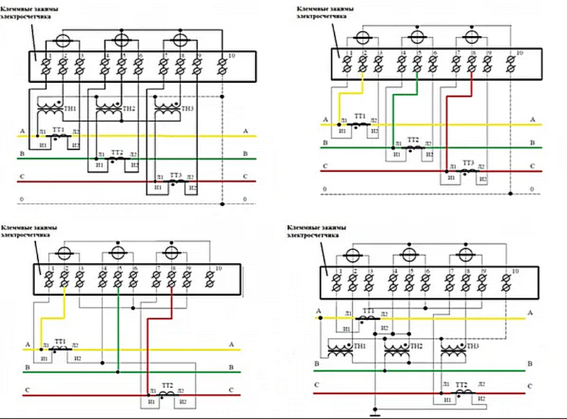 En plus de ceux indiqués, il existe d'autres schémas pour connecter le compteur au transformateur. L'utilisation d'un bloc de test dans la connexion - conformément à la clause 1.5.23 des règles d'installation électrique - est nécessaire lors de l'activation d'un compteur exemplaire. Il s'agit d'un équipement supplémentaire qui permet de dériver et de déconnecter les circuits de courant, en activant les compteurs sans réduire la charge de tension. Un autre point est la possibilité de lectures phase par phase.