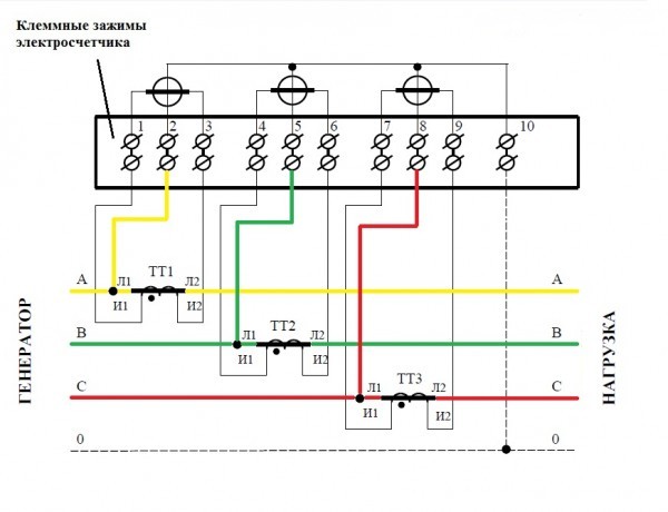 Ce schéma de connexion présente un certain nombre d'avantages et quelques inconvénients. Légèrement différent de dix fils. Il est pratique de travailler avec le compteur - il n'est pas nécessaire d'éteindre complètement le système lorsque vous travaillez avec le panneau, les appareils de mesure et les transformateurs.