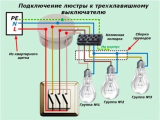 - Seul un conducteur de phase est connecté à l'appareil, qui est commuté sur trois charges différentes. Le noyau zéro a été posé sur le lustre à partir d'une boîte de jonction à proximité pendant la phase de construction.