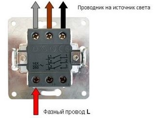 - Lorsqu'une des touches est enfoncée, la tension de phase n'est fournie qu'au circuit s'étendant du contact correspondant vers la charge. Une ampoule séparée ou un groupe de luminaires est connecté.