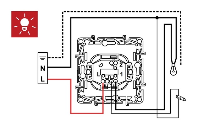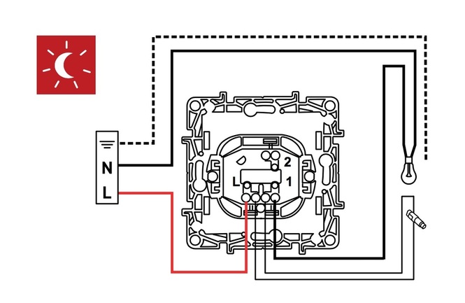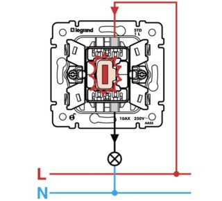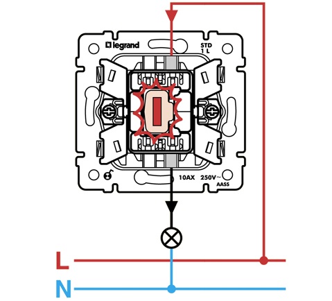 - Rétro-éclairage, où il agit comme un pointeur indiquant où se trouve le commutateur. Il s'allume lorsque l'interrupteur est éteint. Pour connecter le rétroéclairage dans les interrupteurs Legrand (à une ou deux clés), un conducteur de phase suffit.