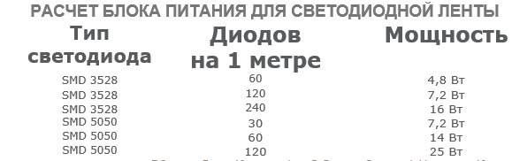 Vous pouvez calculer la puissance requise de l'alimentation pour une bande de 5 mètres de long avec une puissance de 12 W comme suit : 12 W * 5 m = 60 W. Pour la réserve, un coefficient est ajouté : 1,25 * 60 = 75, donc la puissance optimale de l'alimentation est de 75 W.
