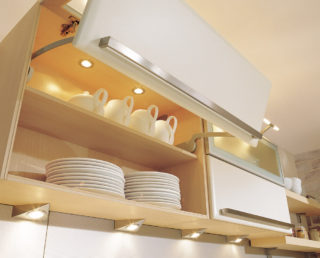 Lors de la conception, il est nécessaire de former une telle répartition du flux lumineux afin que l'éclairage du plan de travail dans la cuisine soit uniforme. Souvent, ils organisent l'éclairage avec des dispositifs d'éclairage ponctuels. Cette méthode présente un avantage par rapport aux bandes LED - le remplacement des lampes par des neuves et la facilité d'entretien.