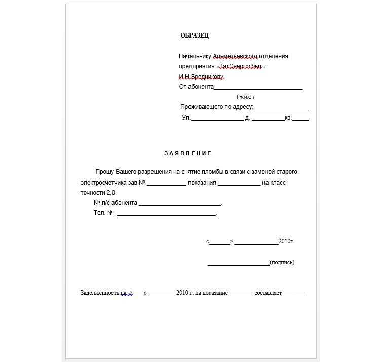 - Une demande est soumise à l'entreprise d'énergie en deux exemplaires. La déclaration enregistre le fait de violation de l'intégrité du sceau, et indique également les lectures du compteur au moment de la détection des dommages.Le premier exemplaire est remis aux salariés, et le second doit être récupéré avec la mention « Accepté pour exécution » avec le numéro et la date d'arrivée.