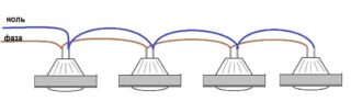La connexion elle-même ne devrait pas être difficile. Une phase est conduite vers le premier luminaire depuis l'interrupteur, puis depuis le premier interrupteur, le câble est tiré vers l'appareil suivant. Un zéro est mis au dernier luminaire, qui vient de la boîte de jonction.