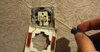 - Si le design est double et que la prise est appairée avec l'interrupteur, il faudra tout démonter. Le plus souvent, la première sortie est retirée, car il y a l'un des boulons de fixation en dessous.