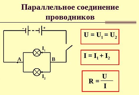 - Méthode parallèle - la tension du circuit électrique est égale à la tension sur chaque élément individuel, elle n'est pas résumée, mais reste la même.