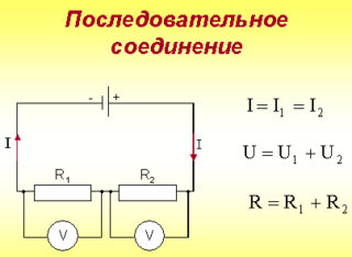 Lors de la connexion de fils en série, l'extrémité d'un câble est connectée au début du suivant. La principale différence entre le circuit électrique est l'absence de dérivation, un seul courant électrique traverse les sections. Dans ce cas, la différence de potentiel de la résistance s'explique par la tension totale aux bornes de chaque résistance individuelle (contact, section, prise de courant).