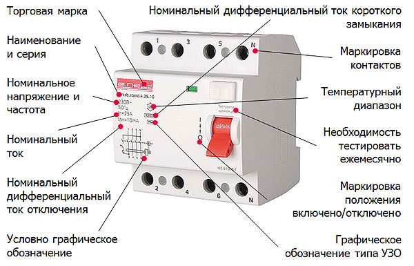 Le courant résiduel d'un RCD est la valeur de fuite à laquelle un appareil donné fonctionne avec certitude. Cet indicateur est appliqué au boîtier de l'appareil et est désigné par I∆n. L'icône est déchiffrée par les chiffres qui la suivent, c'est-à-dire plus précisément la valeur du paramètre pour les courants différentiels de la série suivante : 6 - 10 - 30 - 100 - 300 - 500 mA. La tension de fonctionnement de l'appareil prend deux valeurs (220 et 380 volts).