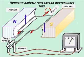Chaque conducteur est équipé d'un aimant, aux extrémités duquel une charge est connectée. Lorsqu'ils sont connectés, un courant alternatif les traverse en permanence. La nature de son origine s'explique par le fait que pendant le fonctionnement les pôles de l'aimant changent constamment de place. Le fonctionnement d'un alternateur est basé sur ce principe.