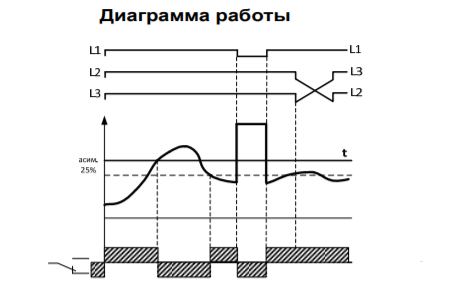 Le schéma de fonctionnement comprend des indicateurs d'alarme et des charges connectées, ainsi que des commutateurs de mode, des régulateurs d'asymétrie et de temporisation. Pour connecter l'appareil, trois bornes sont utilisées, désignées L1, L2 et L3. Comme les disjoncteurs, ils ne prévoient pas le raccordement d'un conducteur neutre (ce qui n'est pas le cas pour tous les modèles de relais).