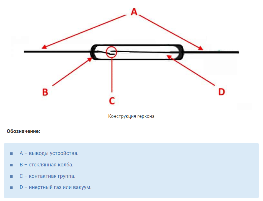 L'interprétation du terme est un contact scellé, qui est déterminé par sa conception. Le dispositif se compose d'une paire de plaques ferromagnétiques scellées dans une capsule de verre. Le réservoir est rempli de gaz inerte, d'azote, d'air séché et possède deux sorties. Une telle ampoule prévient les facteurs externes et augmente la fiabilité de l'appareil.