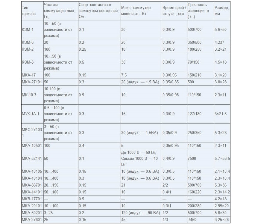 - Puissance de commutation. La limite de l'énergie transmise à travers le commutateur Reed, en tenant compte du matériau et de la section des contacts.