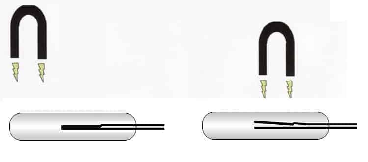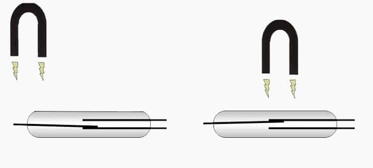 Le principe de fonctionnement d'un interrupteur à lames repose sur l'ouverture ou la fermeture du réseau, là où il se trouve, sous l'influence d'un champ électromagnétique. La tension du flux magnétique détermine la position des contacts. Le champ est généré par un aimant permanent ou électrique.