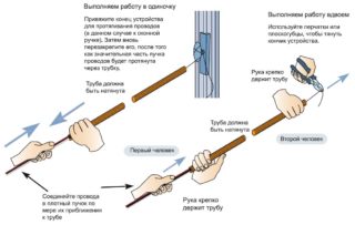 - Un travailleur tient fermement l'extrémité du tuyau à partir duquel le câble est enroulé, et le second tire le fil par l'arrière. Cette approche vous permet de pousser efficacement le fil.