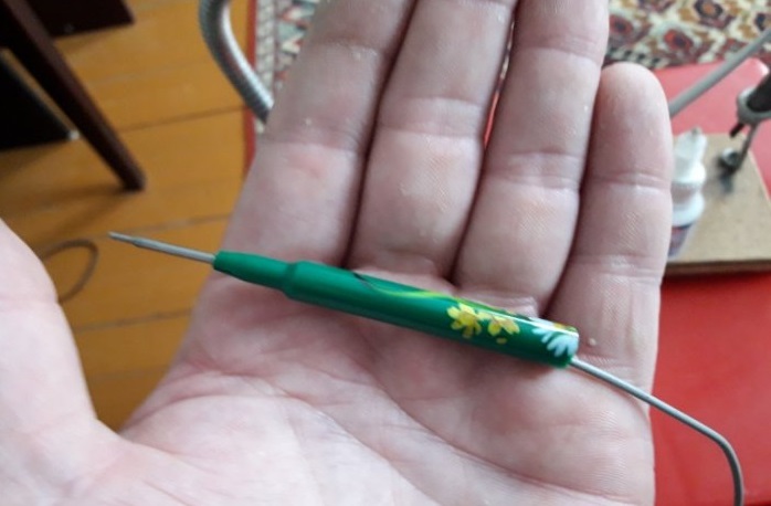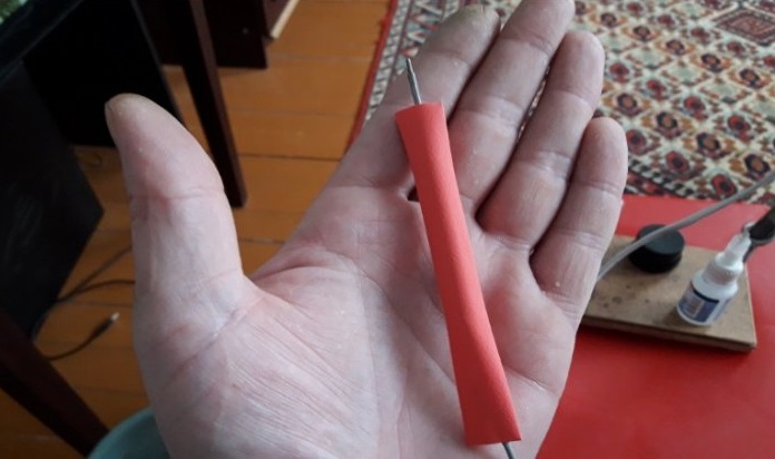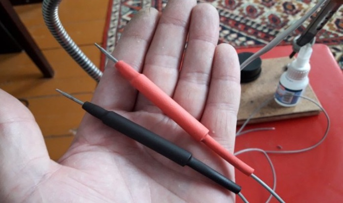 - Les pointes avec des aiguilles sont connectées aux conducteurs flexibles avec un fer à souder. Des morceaux de poignées sont maintenus ensemble.