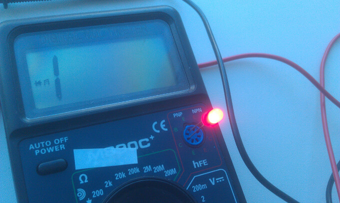 La LED infrarouge émet un rayonnement invisible, il est donc important de surveiller les lectures sur l'écran du multimètre. Les sondes sont installées en appliquant un plus à l'anode et un moins à la cathode. En touchant les sondes à la diode IR de travail, vous pouvez voir le nombre 1000 sur l'écran. Lorsque la polarité est inversée, 1 s'affiche.