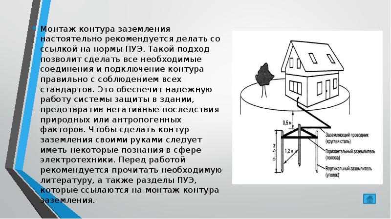 Conformément au PUE, la boucle de masse doit assurer une réception garantie des fuites d'électricité dans toutes les conditions. Pour cela, des normes d'installation dans différents types de sols ont été élaborées.