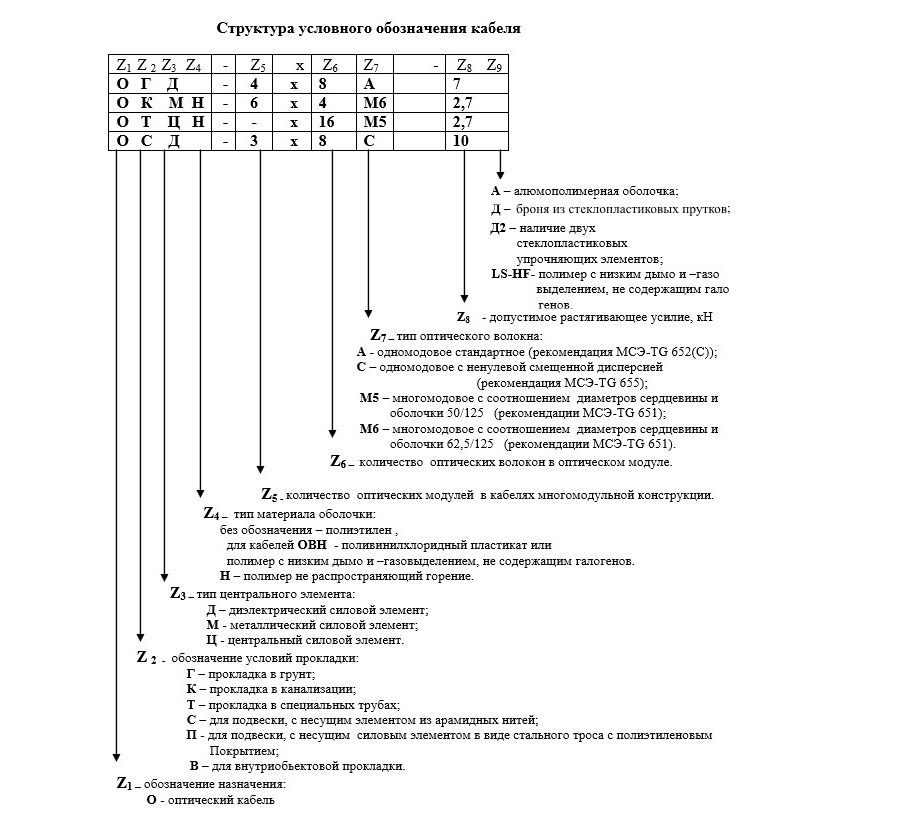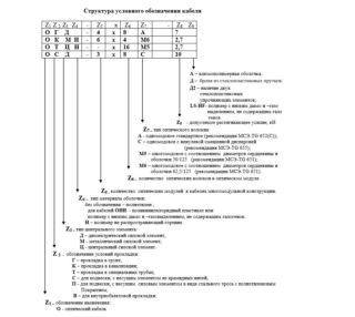 Ces types de conducteurs ont un schéma de désignation différent des câbles classiques. Les deux premières lettres indiquent le but - OK (câble optique). Cela permettra au technicien d'identifier avec précision le conducteur.