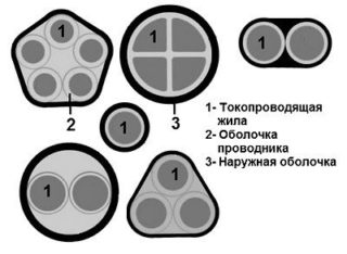 Selon le nombre de conducteurs en cuivre isolés qu'ils contiennent, il y a deux, trois, quatre, 5 et 6 noyaux. La section est très variable (de 1,5 à 250 mm²).
