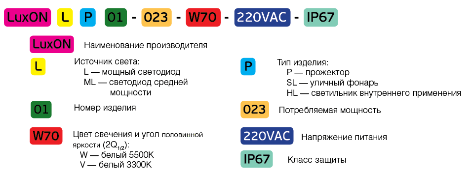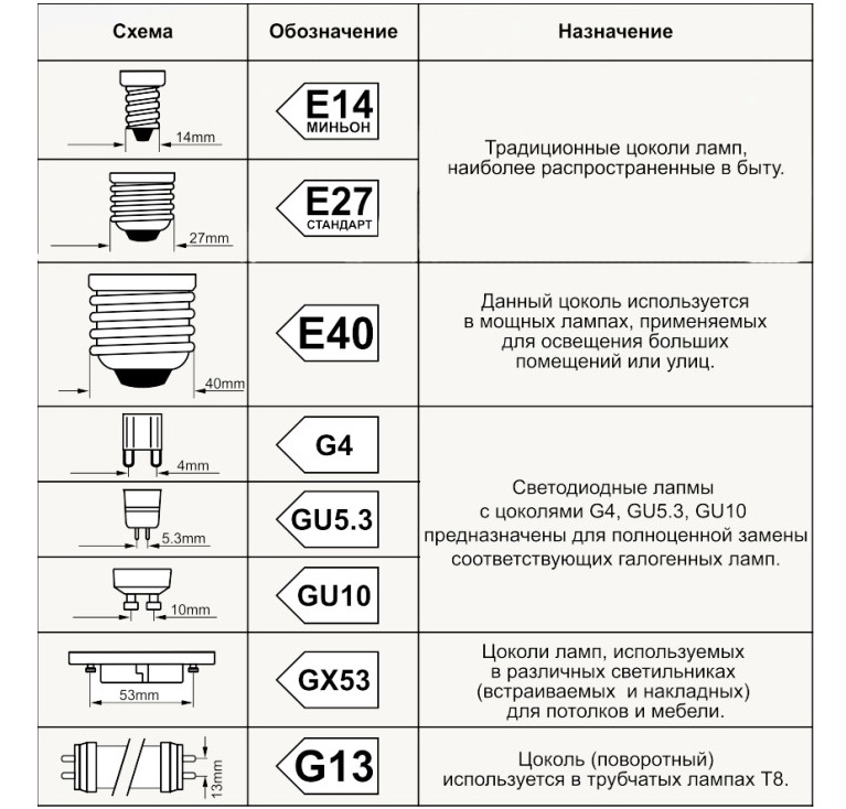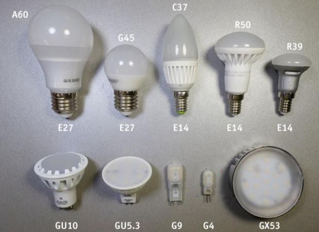 Afin d'adapter avec succès les dispositifs LED sans changements drastiques dans la conception des luminaires, les ingénieurs leur ont donné une forme standard du corps et de la base. Grâce à la conception compacte des pièces internes, ce n'était pas un problème. Selon leur configuration, les appareils à LED ne diffèrent pratiquement pas des produits développés précédemment. Le décodage du marquage LED des luminaires est réalisé selon les normes mondiales unifiées.