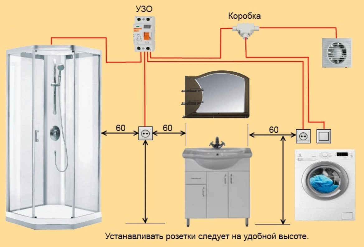 Le PUE fournit une exigence pour l'emplacement des sorties dans la salle de bain - l'intervalle avec une douche est d'au moins 0,6 m.