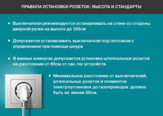 Les prises peuvent être installées n'importe où dans la pièce, la distance par rapport à la surface du sol doit être d'au moins un mètre. Ces informations sont pertinentes pour 2019, vous pouvez vous familiariser avec les exigences plus en détail dans les documents réglementaires russes.