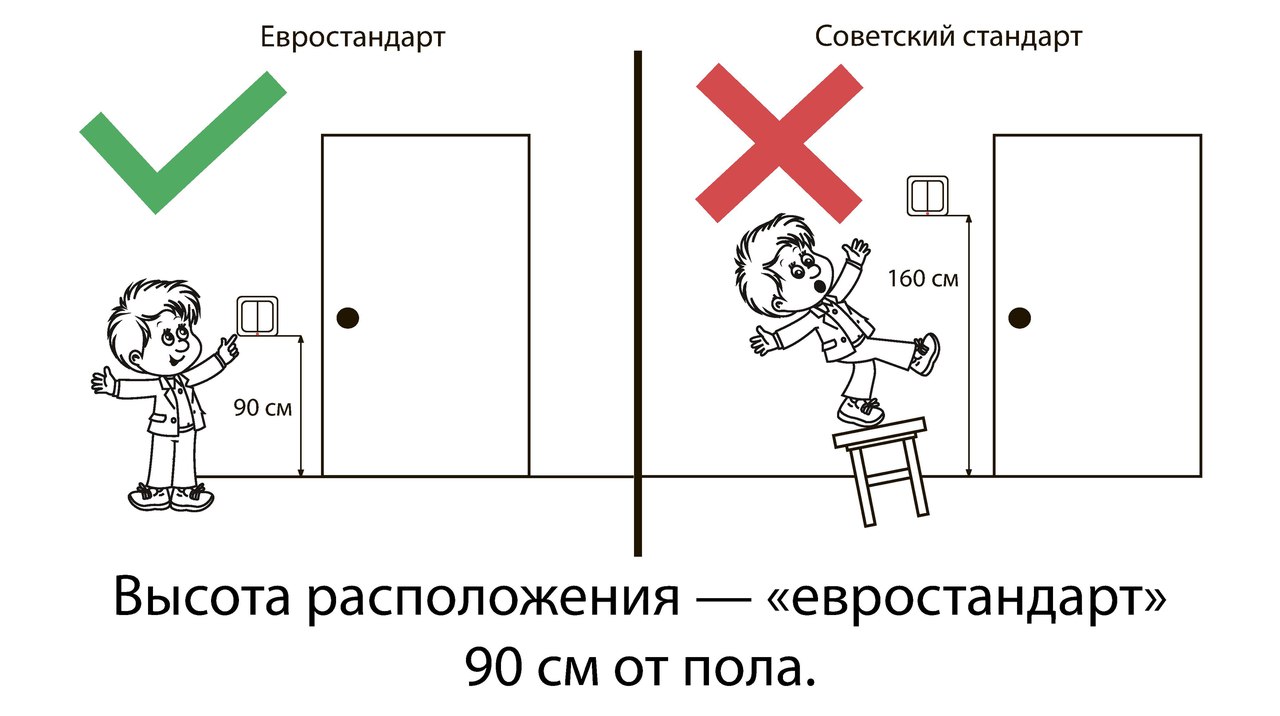 La plupart des immeubles d'habitation en Russie ont été construits à l'époque soviétique. Par conséquent, tous les points électriques ont été placés selon les normes soviétiques - interrupteurs à une hauteur de 1,6 m du sol et prises - 0,9 m.