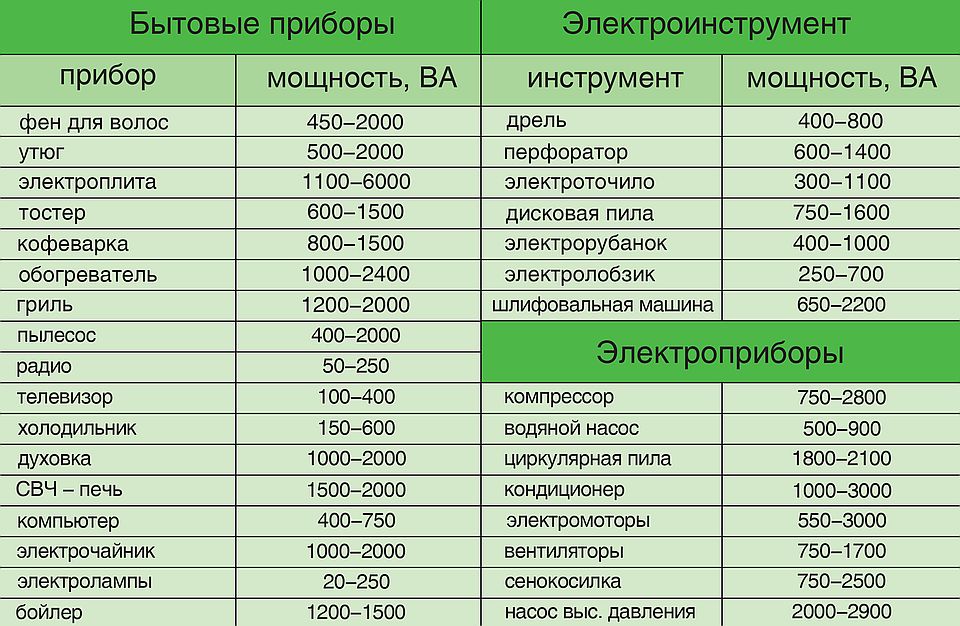 Par exemple, considérons une cuisine où une grande quantité d'équipements est connectée. Tout d'abord, vous devez régler la puissance totale d'une pièce avec un réfrigérateur (500 W), un four à micro-ondes (1000 W), une bouilloire (1500 W) et une hotte (100 W). L'indicateur de puissance totale est de 3,1 kW. Sur sa base, différentes méthodes de choix d'une machine pour 3 phases sont utilisées.