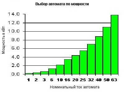 La technologie de sélection ne diffère pas de celle du tableau - vous devrez trouver le calendrier sur Internet. Dans la figure, les commutateurs avec leur charge de courant sont standard horizontalement, tandis que la verticale correspond à la consommation d'énergie dans une section du circuit.