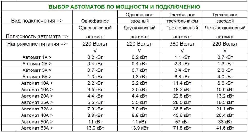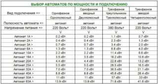 Sur la base du tableau des appareils, en fonction de la puissance de raccordement, un appareil monophasé ou triphasé est sélectionné. Mais la valeur dans les calculs peut ne pas coïncider avec les données tabulaires. Pour une section de réseau de 3,1 kW, un modèle 16 A est nécessaire - la valeur la plus proche est de 3,5 kW.
