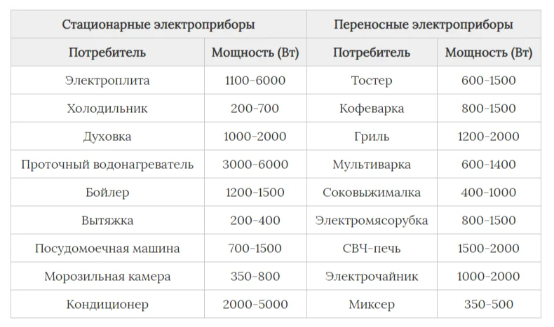 Le calcul de la puissance totale des appareils électroménagers vous aidera à choisir un interrupteur de protection. Vous devrez regarder la valeur dans le passeport de l'appareil. Par exemple, dans la cuisine, la prise comprend :