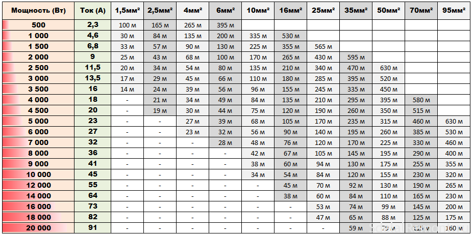 En fonction des conditions environnementales et de la méthode de pose du câble, il est nécessaire de prendre en compte le facteur de correction pour le réseau 220 V. La valeur moyenne est de 5 A. Il faudra l'ajouter à l'indicateur de courant calculé Icalcul= 14 + 5 = 19 A. De plus, selon le tableau PUE, la section du fil de cuivre est sélectionnée.