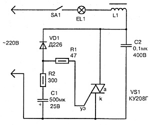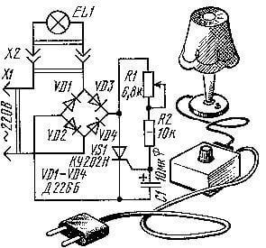 Le circuit en pont redresseur utilise la lampe comme limiteur de charge et de courant. Un circuit de décalage et un thyristor sont installés sur les épaules du redresseur. L'installation d'un pont de diodes est dictée par la spécification du fonctionnement du thyristor.