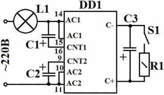 Dans cette conception, le microcircuit lui-même régule la tension de la lampe avec un filament d'une puissance allant jusqu'à 150W. Pour contrôler une charge plus élevée, un plus grand nombre de luminaires, un triac de puissance auxiliaire doit être inclus dans le circuit de contrôle de manière synchrone.