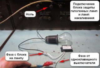 Si des lampes pour 220 V sont utilisées dans des appareils d'éclairage, l'unité de protection est connectée au circuit de manière séquentielle. La polarité du câblage n'a pas d'importance, l'essentiel est que l'appareil soit connecté à une rupture de fil avec une phase, c'est-à-dire en série avec l'interrupteur.