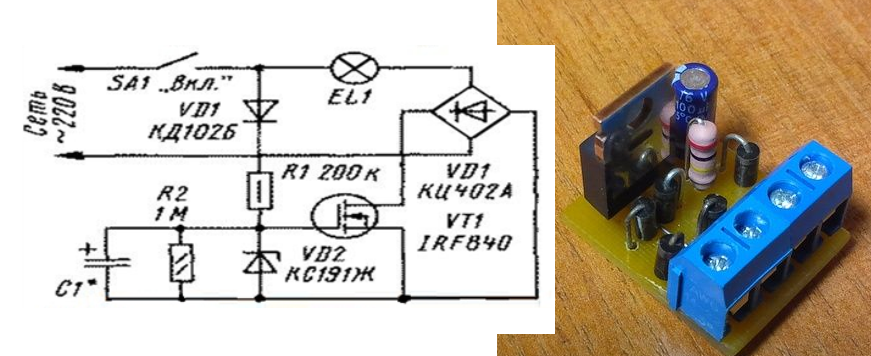 Après avoir appliqué une tension au circuit, le courant commence à traverser le filament et arrive au pont, tandis que l'électrolyte est chargé avec une résistance entre-temps. Il commence à s'ouvrir lorsque la limite de tension du thyristor est atteinte, après quoi le courant de la lampe le traverse. En conséquence, le filament de tungstène chauffe doucement. Le temps de réchauffement dépend directement de la capacité du condensateur et de la résistance intégrée au circuit.