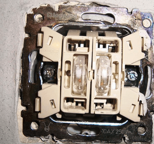 Avant de réparer l'interrupteur défectueux, vous devrez dévisser les vis de fixation et retirer le boîtier avec, dans la mesure où la longueur des conducteurs le permet. S'ils sont courts, la fixation est desserrée et l'appareil lui-même est sorti du boîtier en plastique (on se souvient d'abord lequel des conducteurs était connecté à où).