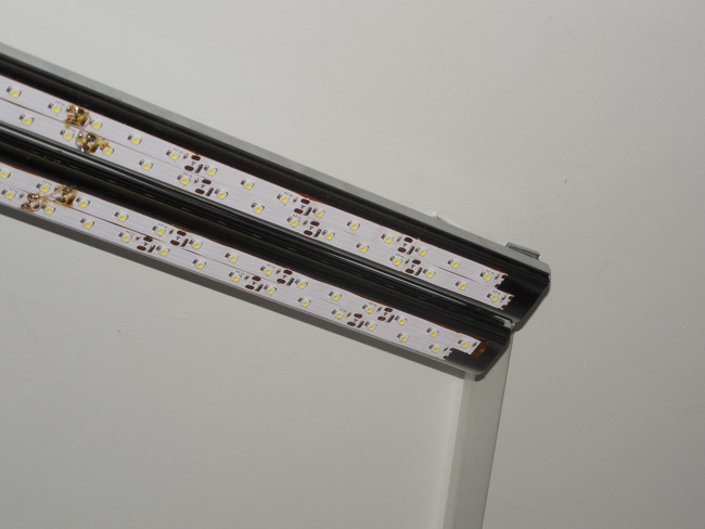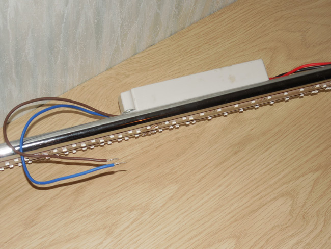 - Fixation du ruban au profilé en aluminium. Dans un premier temps, il est recommandé de coller légèrement le ruban afin de pouvoir corriger les inexactitudes. Une fois que l'utilisateur est convaincu que tout est collé correctement et uniformément, vous pouvez niveler la bande LED sur toute la surface et connecter les fils.
