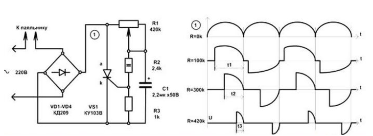 Le thyristor a deux positions stables ("ouvert" ou "fermé"), qui sont commutées par la tension. Lorsqu'une charge apparaît, elle s'allume, lorsqu'il y a une perte de courant électrique, elle s'éteint. Les radioamateurs débutants apprennent à collecter de tels régulateurs. Les fers à souder fabriqués en usine avec contrôle de la température de la panne sont chers. Il est beaucoup moins cher d'acheter un simple fer à souder et d'assembler vous-même un registre de tension.