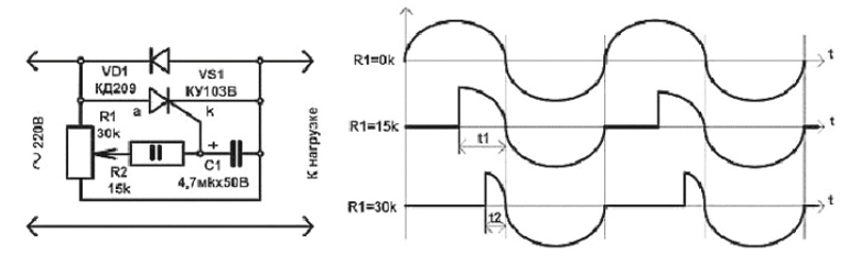 Le régulateur de tension, dont le schéma est présenté ci-dessus, a une conception simplifiée. Une demi-onde est commandée ici, tandis que l'autre traverse VD1 sans modification. Fonctionne dans un scénario similaire.