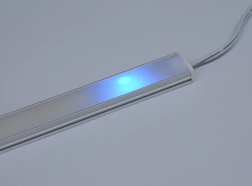 Les adhérences sont isolées avec de la colle thermofusible ou une gaine thermorétractable. Dans l'appareil sélectionné, les pièces doivent être d'un seul côté. S'ils sont sur des côtés différents, l'interrupteur ne peut pas être fixé dans le profilé. L'emplacement du capteur est indiqué par une LED bleue. Le ruban, avec l'interrupteur, est fixé dans le profilé en aluminium sur du ruban adhésif double face, un panneau de protection est installé et fixé avec un bouchon.