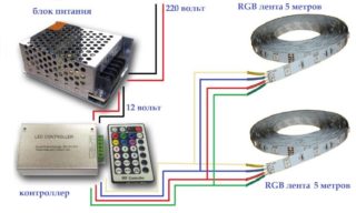 Le rétroéclairage LED diffère des autres lampes par sa faible consommation d'énergie (jusqu'à 24 V), par conséquent, les rangées de diodes sont connectées au réseau via une alimentation. Le choix de ce dernier doit être effectué avec une réserve de marche de 15-20%. L'interrupteur est entre les deux.