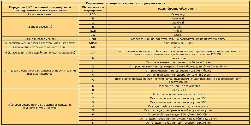 Lors du choix d'un bloc, ils sont guidés par la puissance de la bande LED. Le paramètre du transducteur doit être supérieur de 20 à 30 %. La puissance de 1 m de la lampe est indiquée par le fabricant Pour calculer la consommation totale, cet indicateur est multiplié par le nombre de compteurs du segment. En l'absence de données, vous pouvez utiliser un tableau spécial, qui résume les capacités des types courants de bandes. Exemple de calcul :