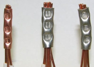 Les conducteurs en cuivre toronnés peuvent être terminés par des cosses spéciales en tube de cuivre percé pour un boulon. Il existe deux modifications de ces dispositifs - non revêtus et étamés. Ils sont également marqués TM (TML), après quoi la section transversale du fil sous la pince est indiquée en millimètres et le diamètre du trou de la pointe en mm. La fixation de telles pinces est réalisée par sertissage à l'aide de pinces spéciales. Il n'est pas recommandé d'utiliser des pinces ordinaires ou un marteau, sinon le mécanisme pourrait être endommagé. Le nombre de sertissages doit être de deux ou plus pour une installation fiable.