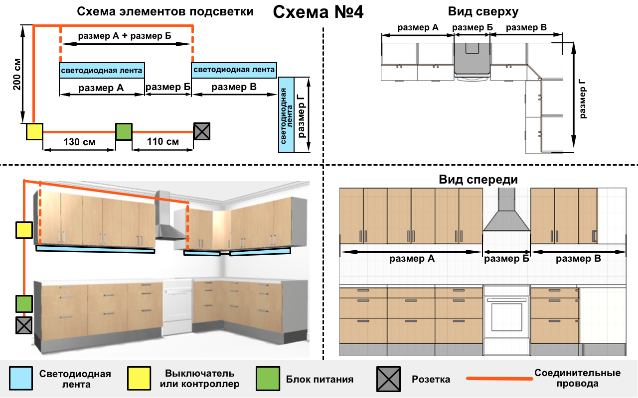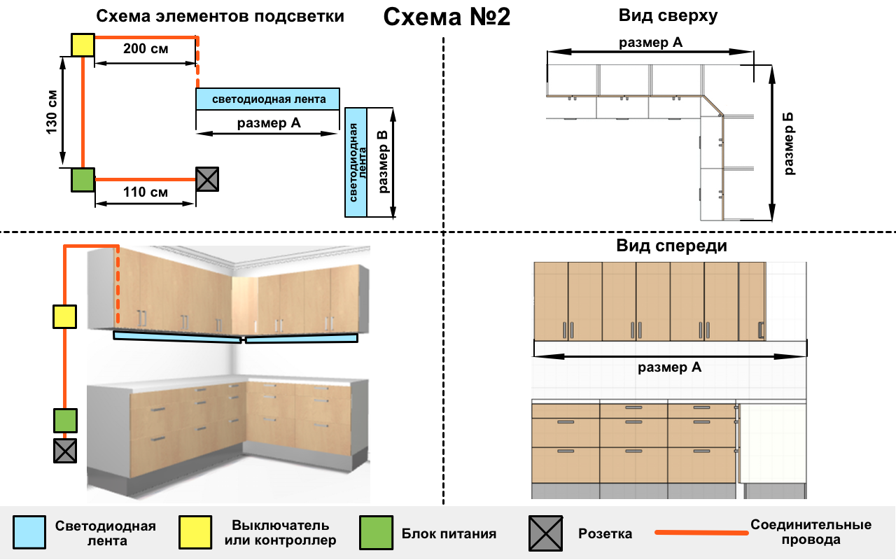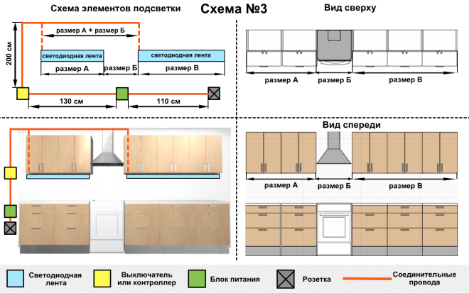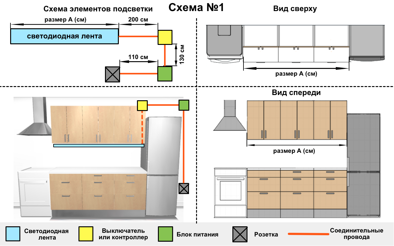 L'utilisateur peut choisir entre des LED chaudes et froides, ainsi qu'ajuster la luminosité de la source lumineuse. Une lumière jaune chaude accentuera la beauté des meubles en bois ou des comptoirs en bois. Une lumière de couleur similaire à la lumière naturelle et modérément brillante peut remplacer partiellement la source lumineuse principale. L'éclairage de différentes couleurs, y compris le spectre infrarouge et ultraviolet, est utilisé pour créer des effets décoratifs. Avec l'utilisation correcte de l'éclairage multicolore, l'apparence de la cuisine change radicalement en quelques secondes. Couleurs standards : blanc, orange, vert, rouge, bleu, magenta, mais il peut y en avoir d'autres.