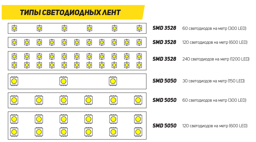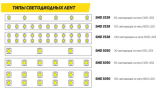 Pour l'éclairage principal, il est nécessaire de sélectionner des diodes avec une émission lumineuse vive. Ceux-ci incluent SMD 5630, 5730, 2835 (taille compacte). En plus d'une luminosité élevée, ils ont un grand angle d'émission lumineuse - jusqu'à 160 degrés. L'intensité lumineuse est également déterminée par la consommation d'énergie. Il varie de 4,8 à 32 volts par mètre linéaire.